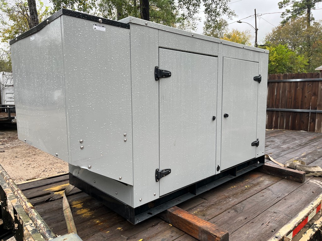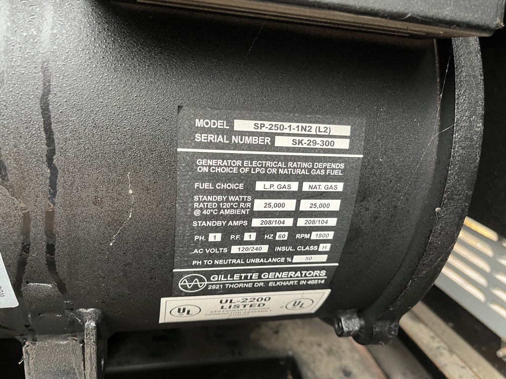 Surplus Gillette SP-250-1-1N2 Natural Gas Generator Set; 2021 Model – Unused; 25kW Standby Rated; 120/240V; 1800RPM Engine; Heavy Duty Commercial Rated; Sound Attenuated Enclosure; 1″ Flex Fuel Line – 16″L; Jacket Water Heater; Space Heater; Digital Control Panel; Breaker – In Stock – Ready to Ship!