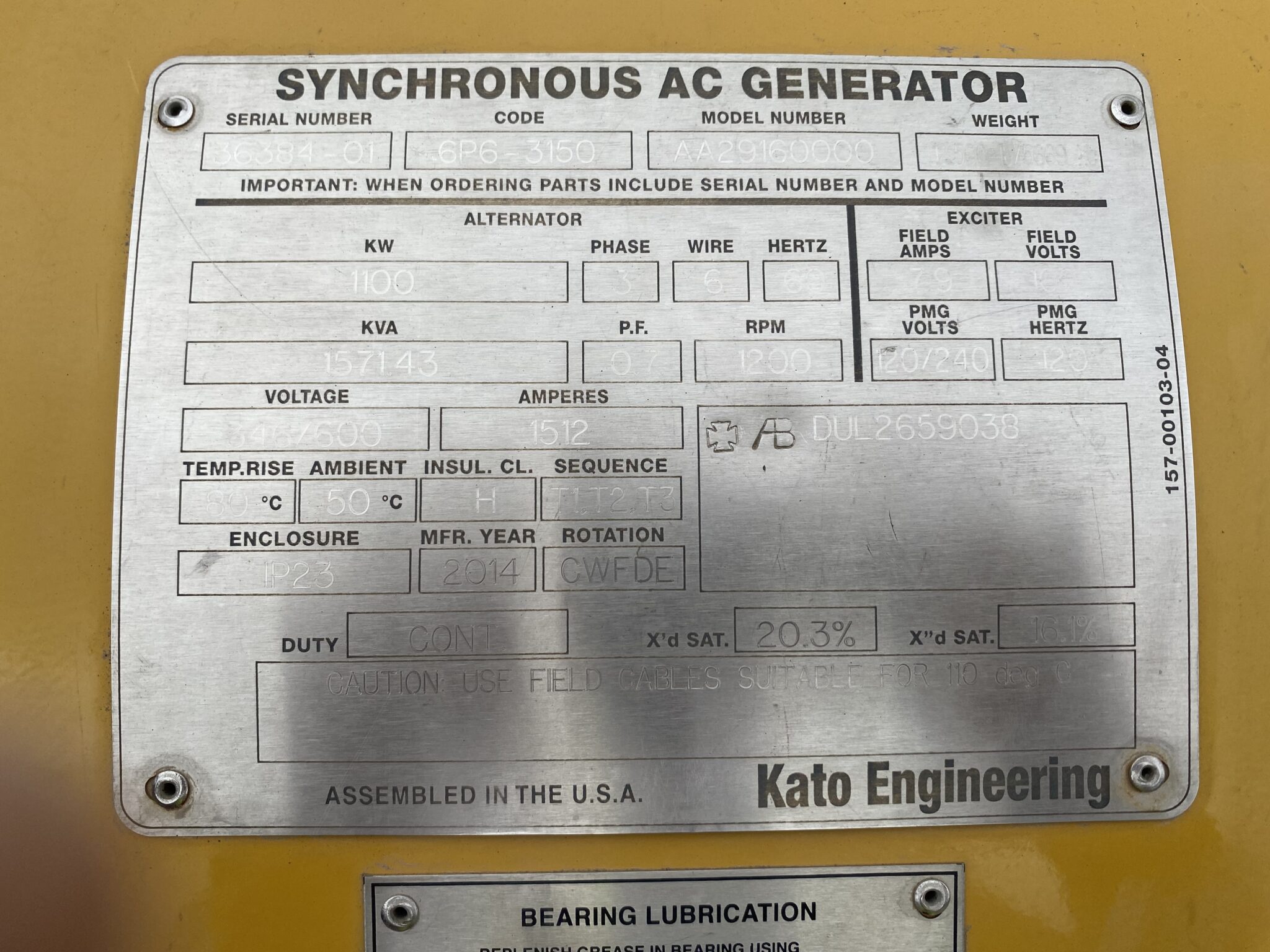 Surplus / Unused Kato 6P6-3150 Generator End; 2014 Model; 1100kW / 1571.43kVA Continuous Duty; 346/600V; 60Hz, 0.7PF; 1200RPM; Double Bearing; 80C @ 50C Temp Rise Rating; ABS Compliant; In Stock