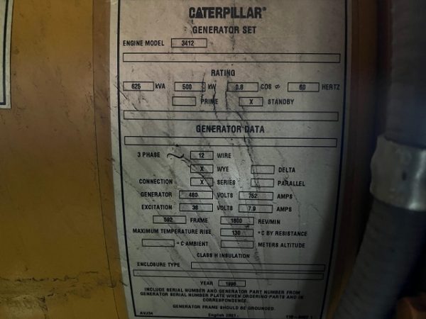 Used CAT 3412C Generator Set; 1998 Model – 863 Hours; 500kW Standby Rated; 480/277V; Sound Attenuated Enclosure; EMCP Control Panel; Circuit Breaker; Load Tested and Serviced; In Stock