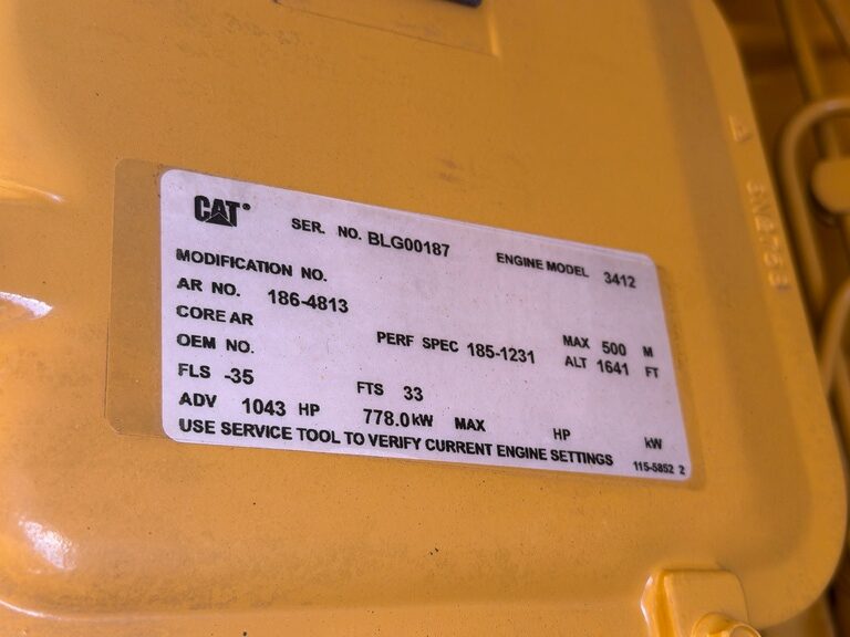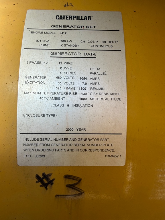 Used CAT 3412C Generator Set; 2000 Model – 493 Original Hours; 700kW Standby Rated; 480/277V; Weather Enclosure; Base Fuel Tank; EMCP 2 Controller; Breaker; Jacket Water Heater, Battery Charger; Three Matching Units Available; Exterior Repainted – Cleaned – Serviced – Load Tested