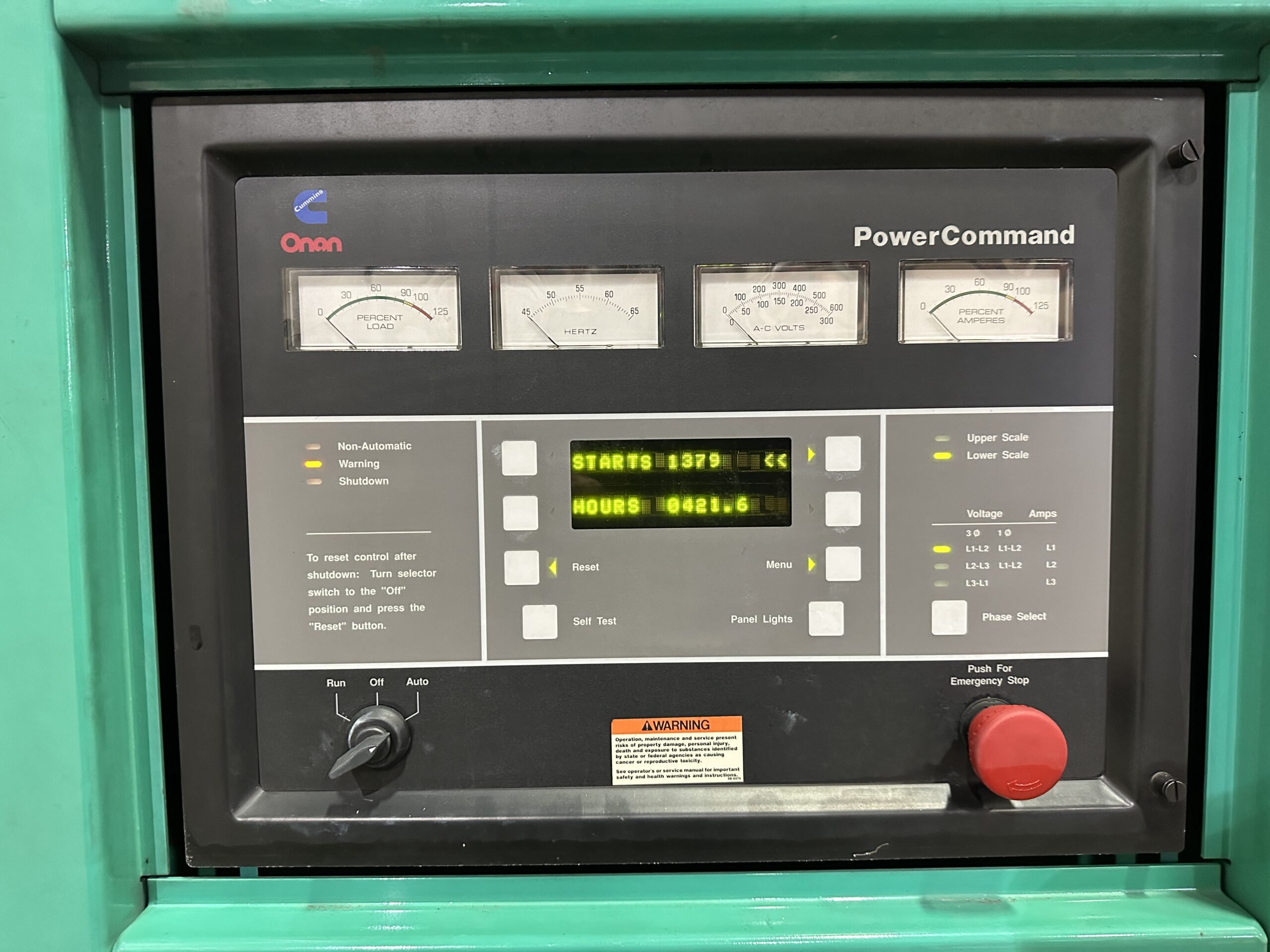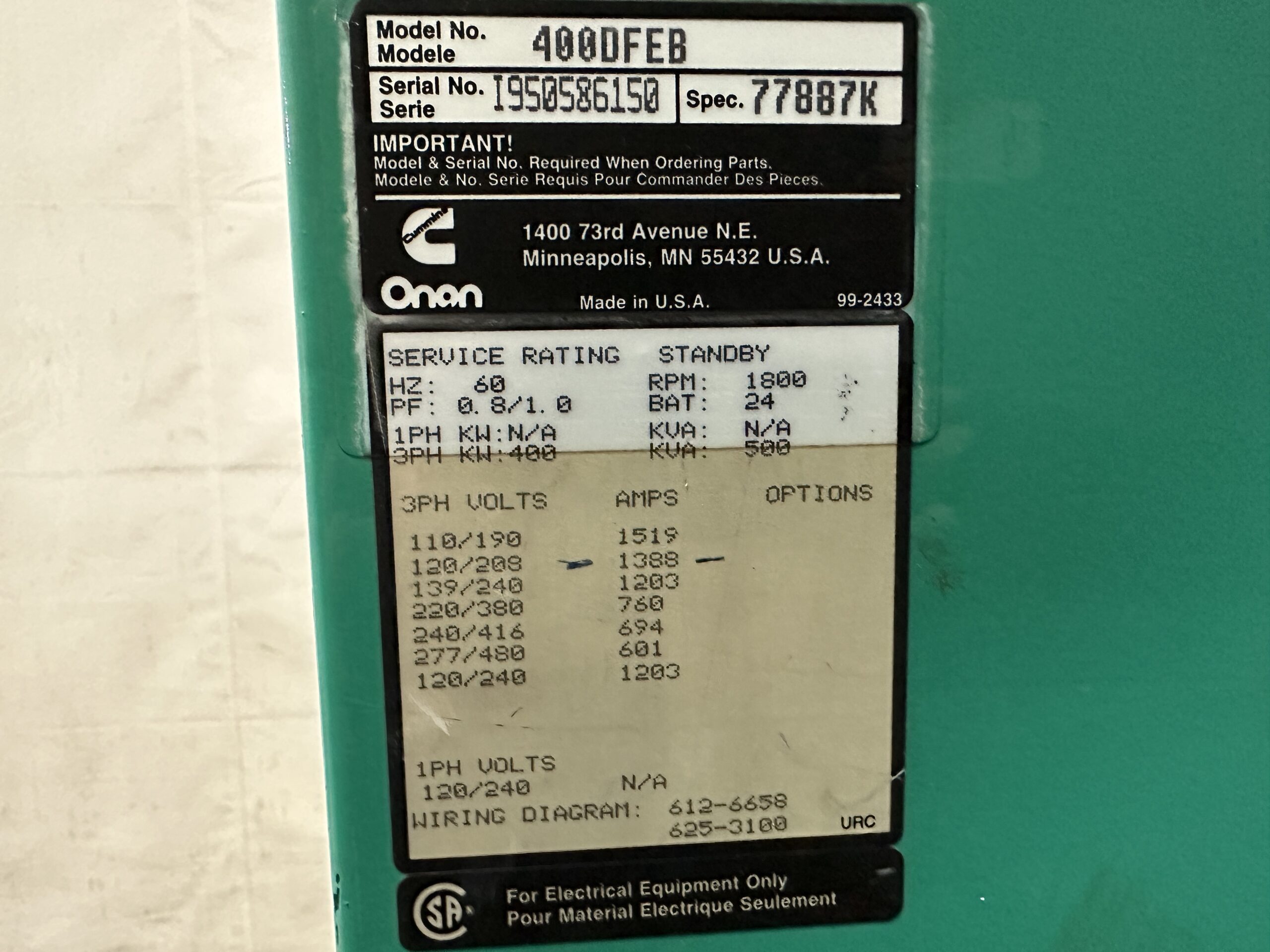Good Used Cummins DFEB / KTA 19-G2 Generator Set; 1995 Model – 421 Original Hours; 400kW Standby Rated; Open Skid Mounted; Digital Power Command Controller; 1200A Breaker; Load Tested and Serviced