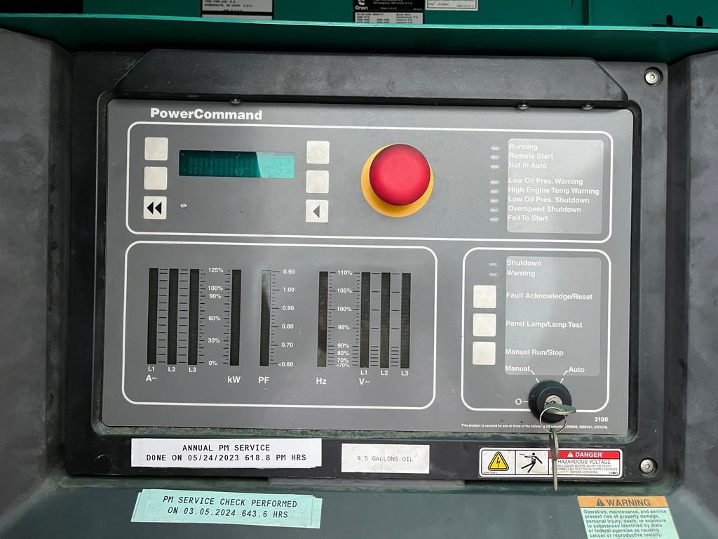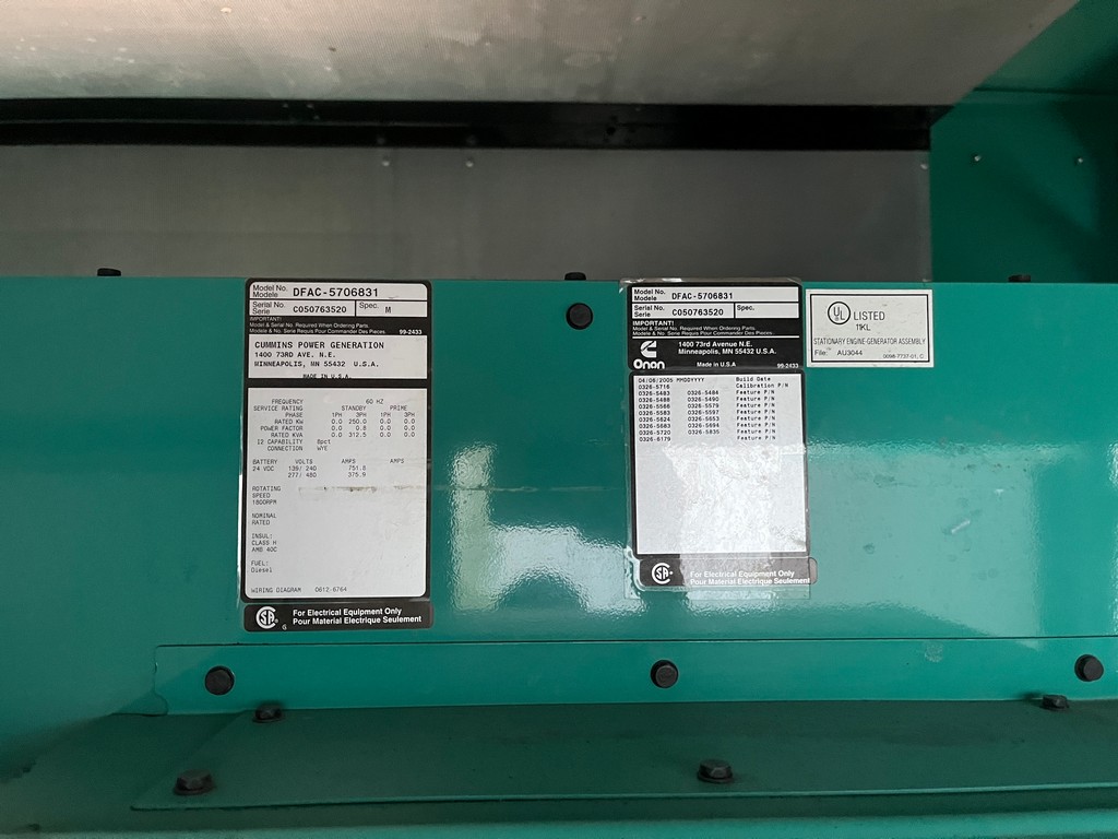 Used Cummins DFAC Generator Set; 2005 Model – 629 Hours; 250kW Standby Rated; 480/277V; Sound Attenuated Enclosure; Base Fuel Tank; Digital Control Panel; Breaker; Load Tested and Serviced