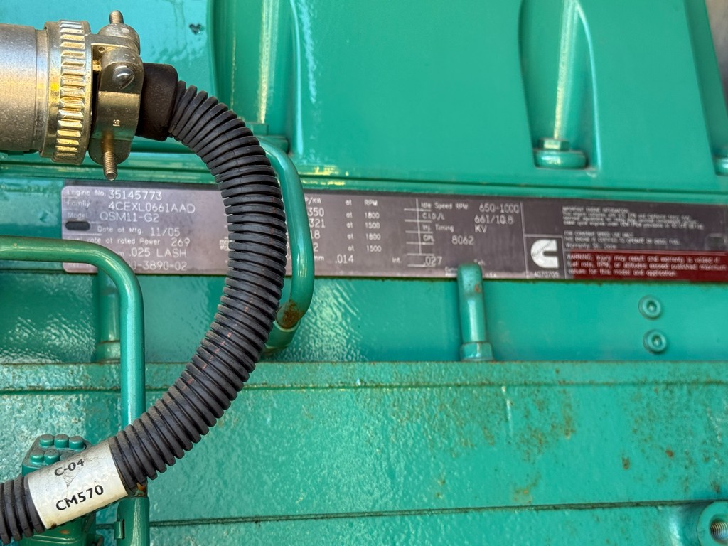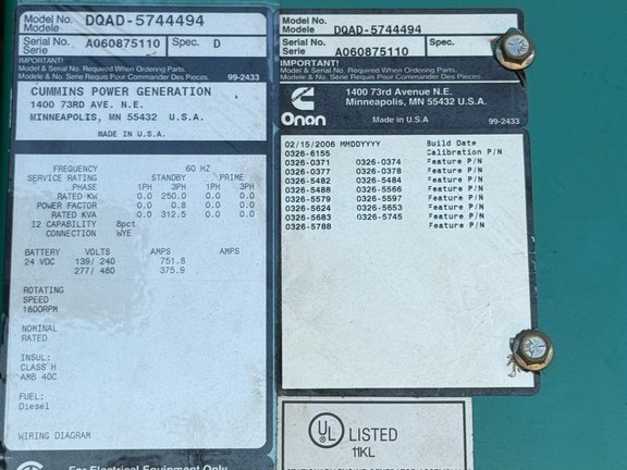 Used Cummins DQAD Generator Set; 2006 Model – 385 Hours; 250kW Standby Rated; 208V; Sound Attenuated Enclosure; Base Fuel Tank; Tier 2 – QSM11-G2 Engine; Digital Control Panel; Breaker; Jacket Water Heater; Battery Charger; Load Tested and Serviced