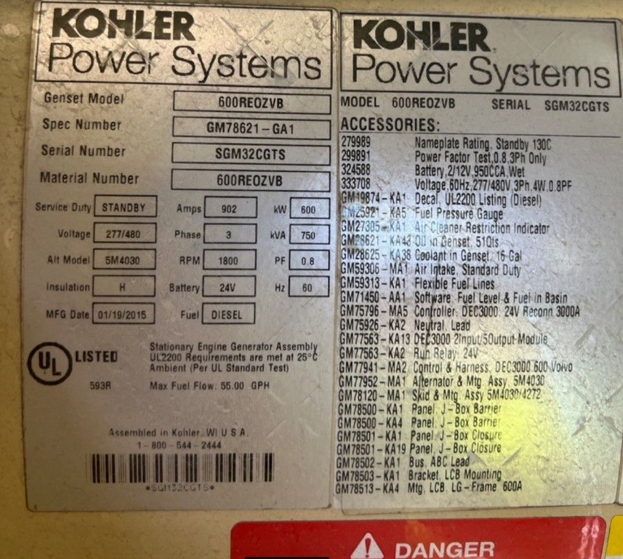 Low Hour Used Kohler 600REOZVB Generator Set; 2015 Model – Low Hours; 600kW Standby Rated; 480/277V; Sound Attenuated Enclosure; Digital Control Panel; Base Fuel Tank; Circuit Breaker; Tier 2 Emissions; Serviced and Load Tested